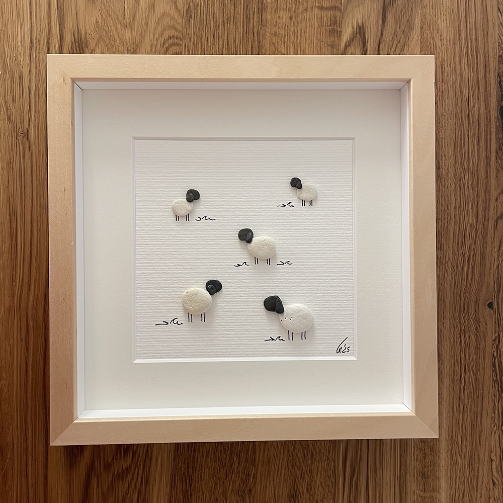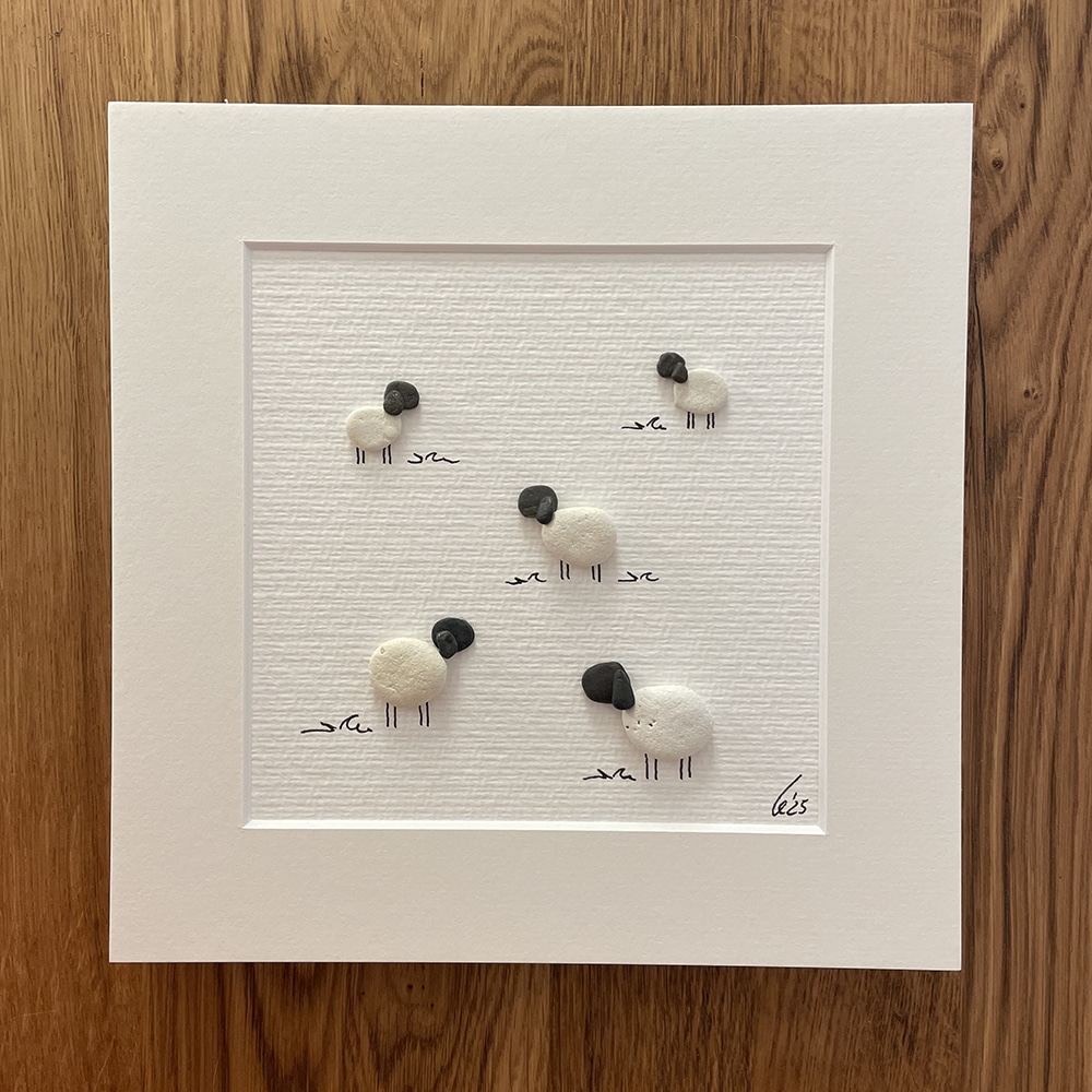 Kieselsteinbild auf Aquarellpapier in weißem Passepartout, optional gerahmt