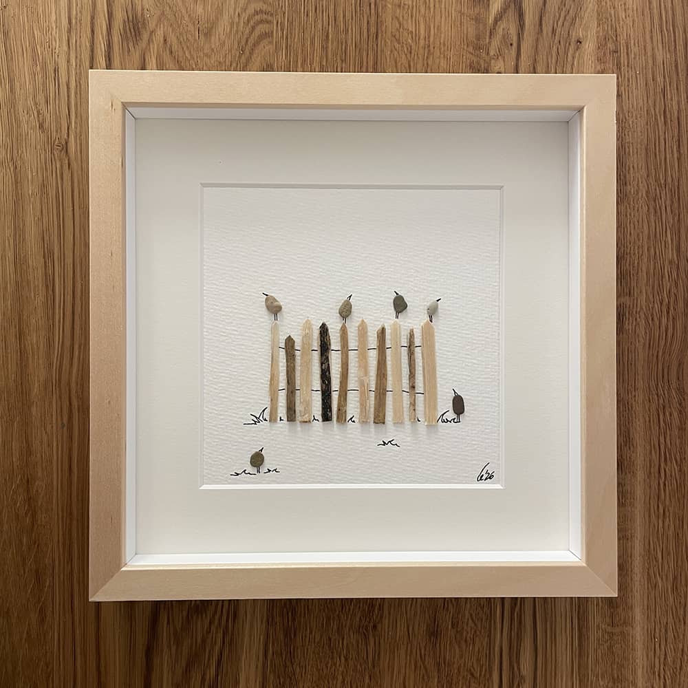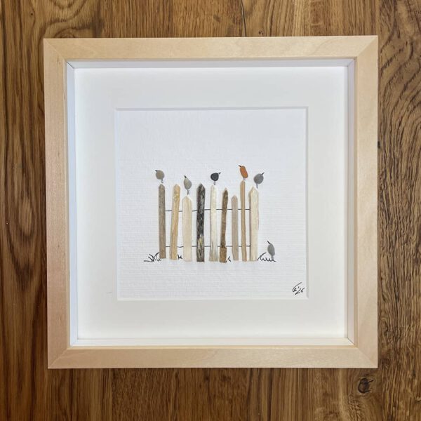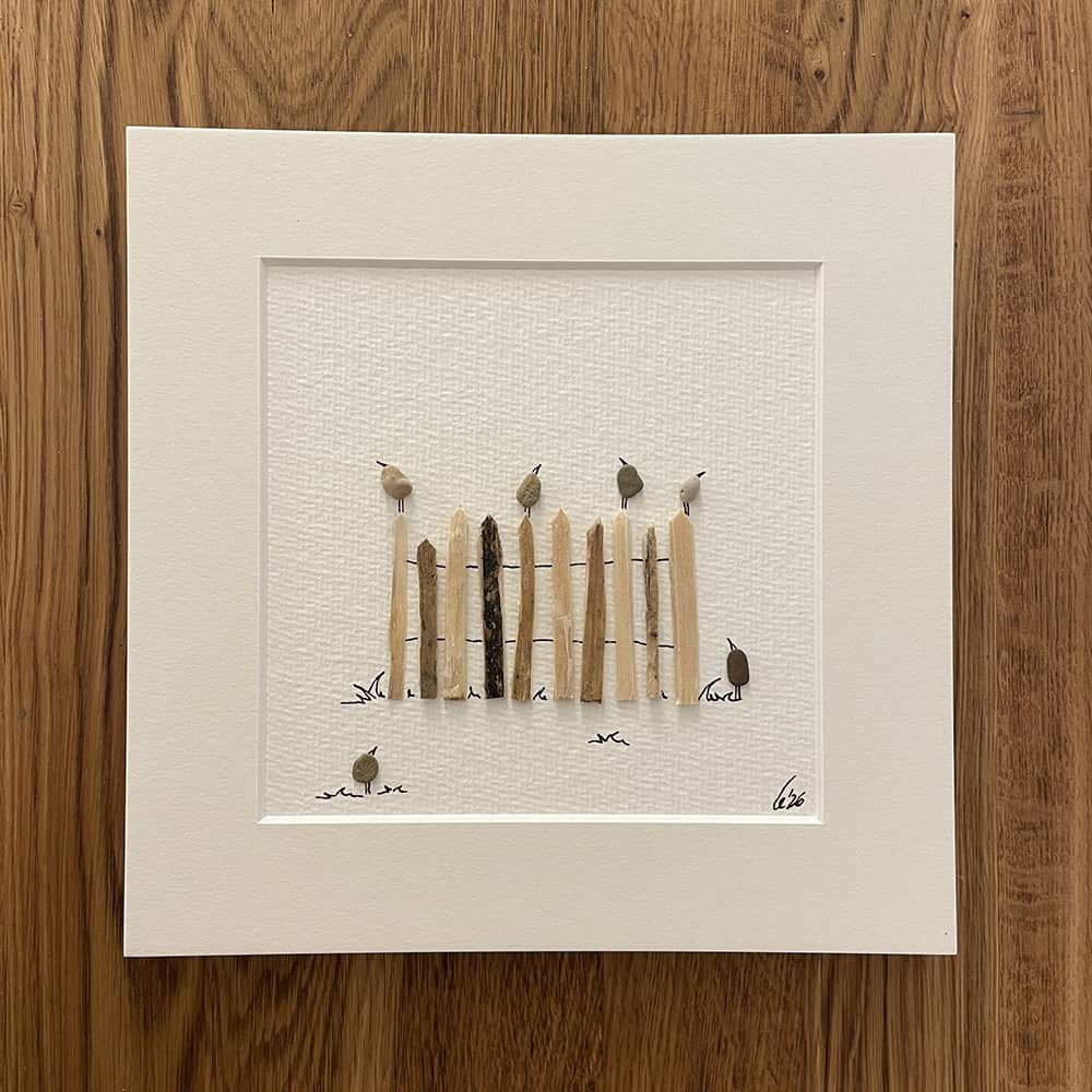 Kieselsteinbild auf Aquarellpapier in weißem Passepartout, optional gerahmt