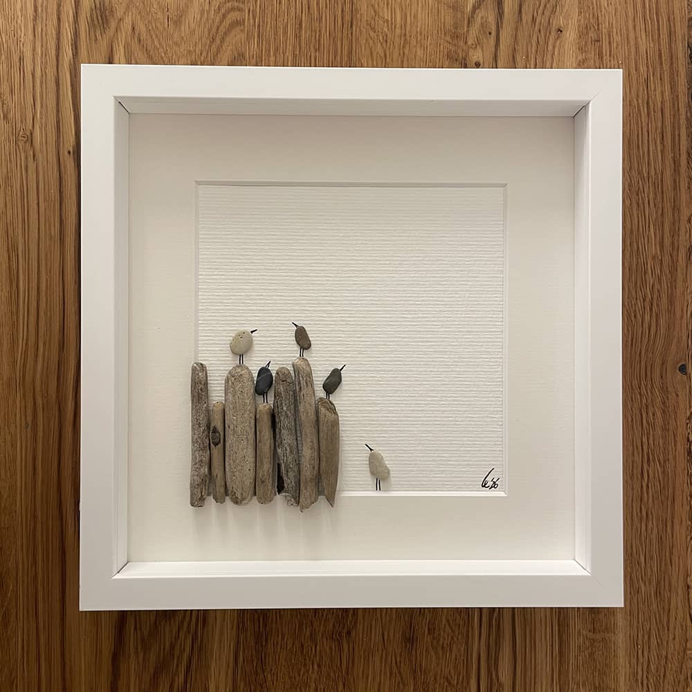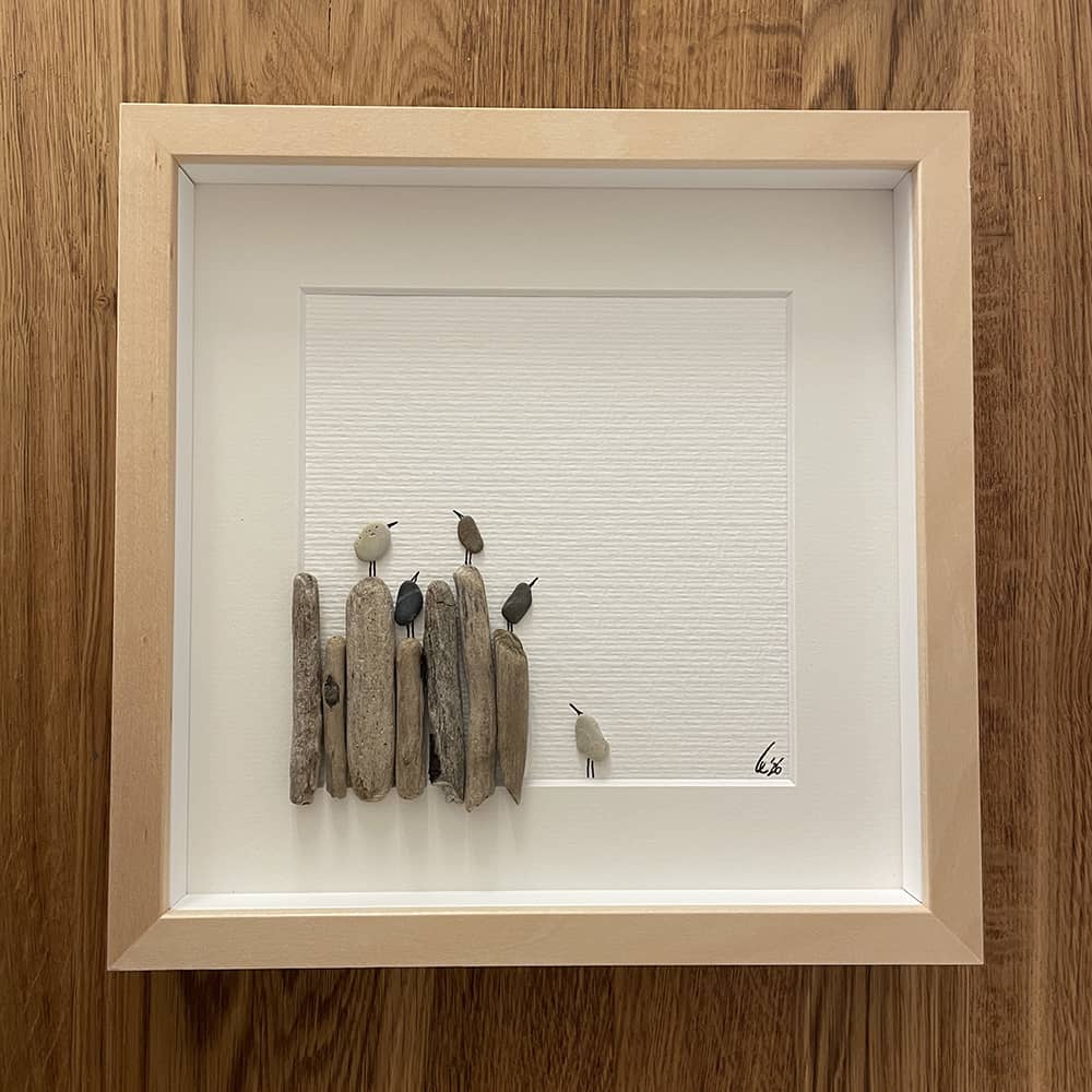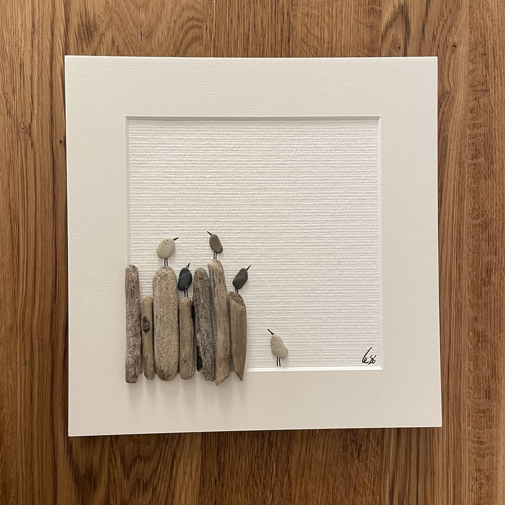 Kieselsteinbild auf Aquarellpapier in weißem Passepartout, optional gerahmt