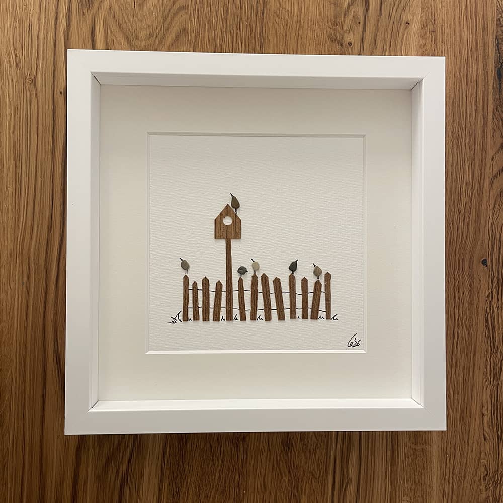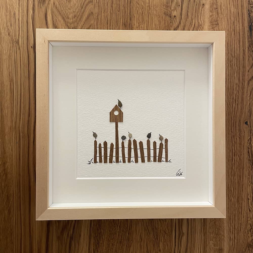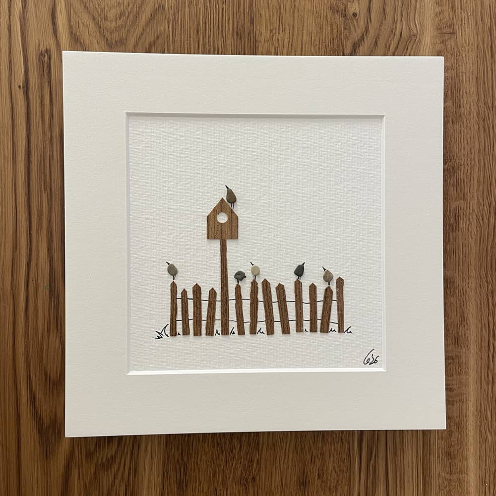 Motiv: Vögel auf Zaun mit Vogelhaus