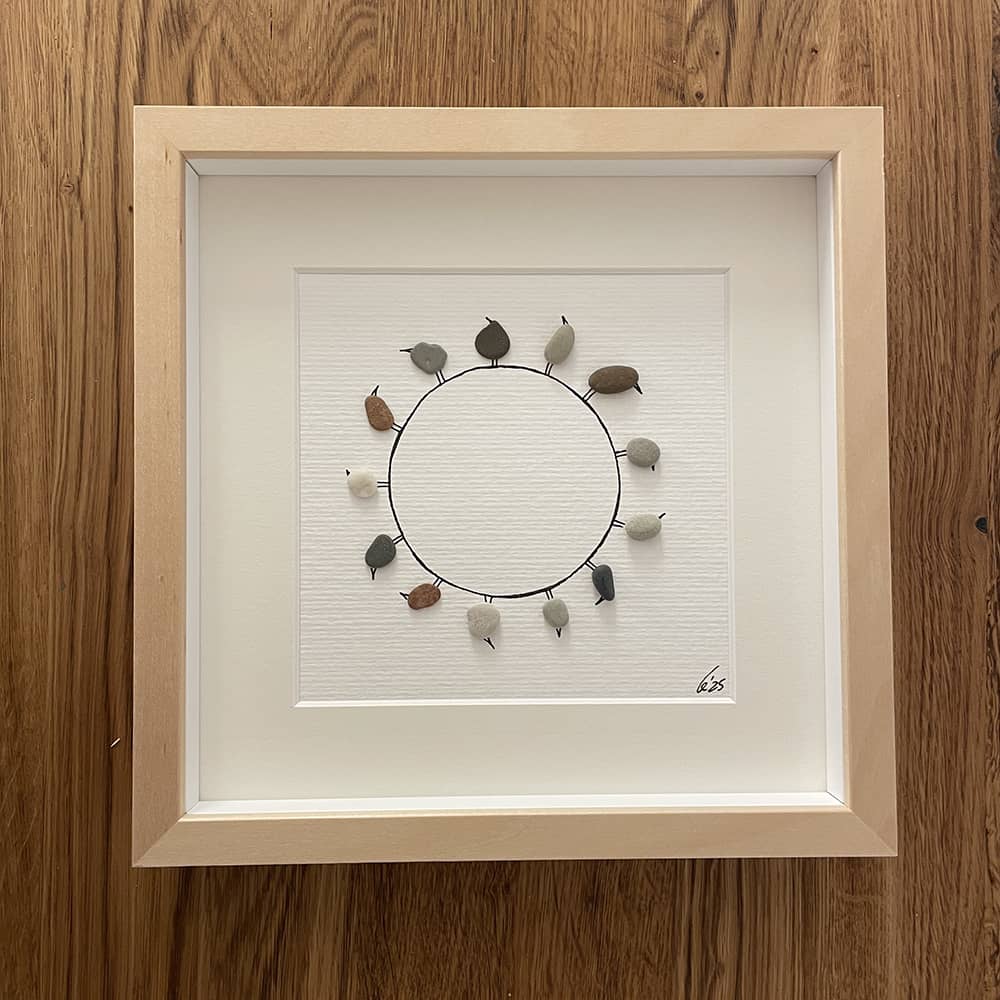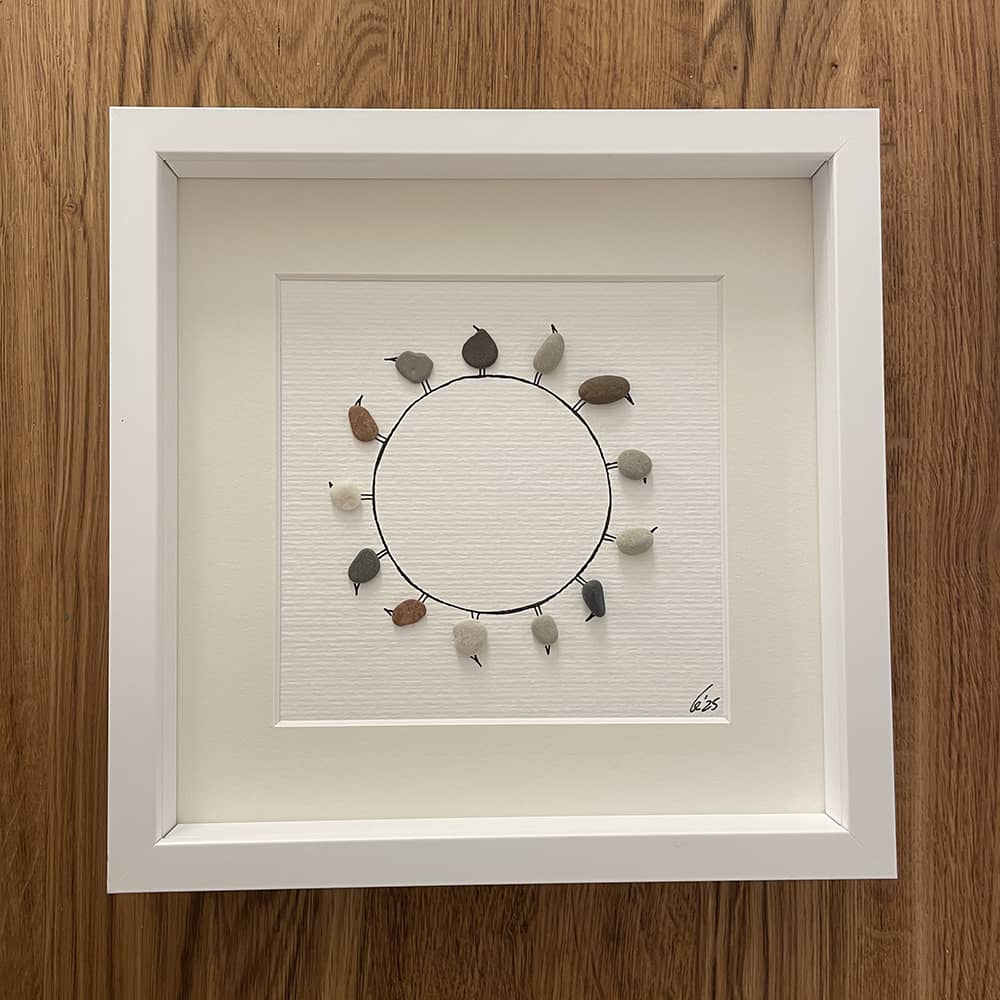 Kieselsteinbild auf Aquarellpapier in weißem Passepartout, optional gerahmt