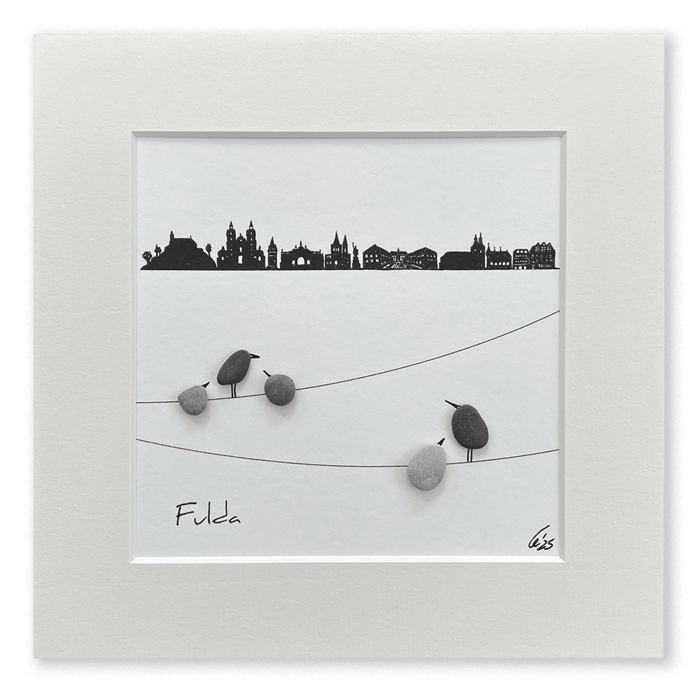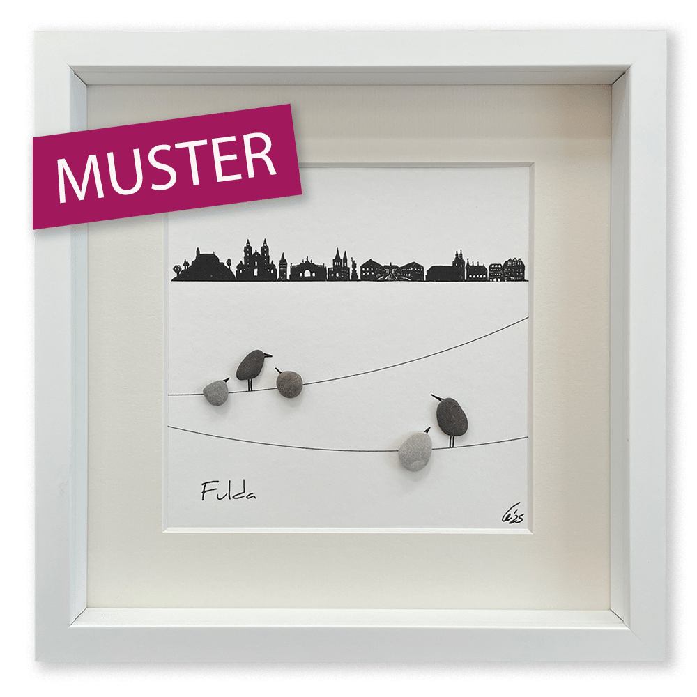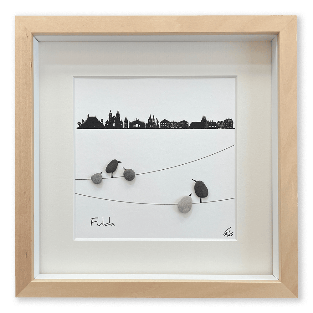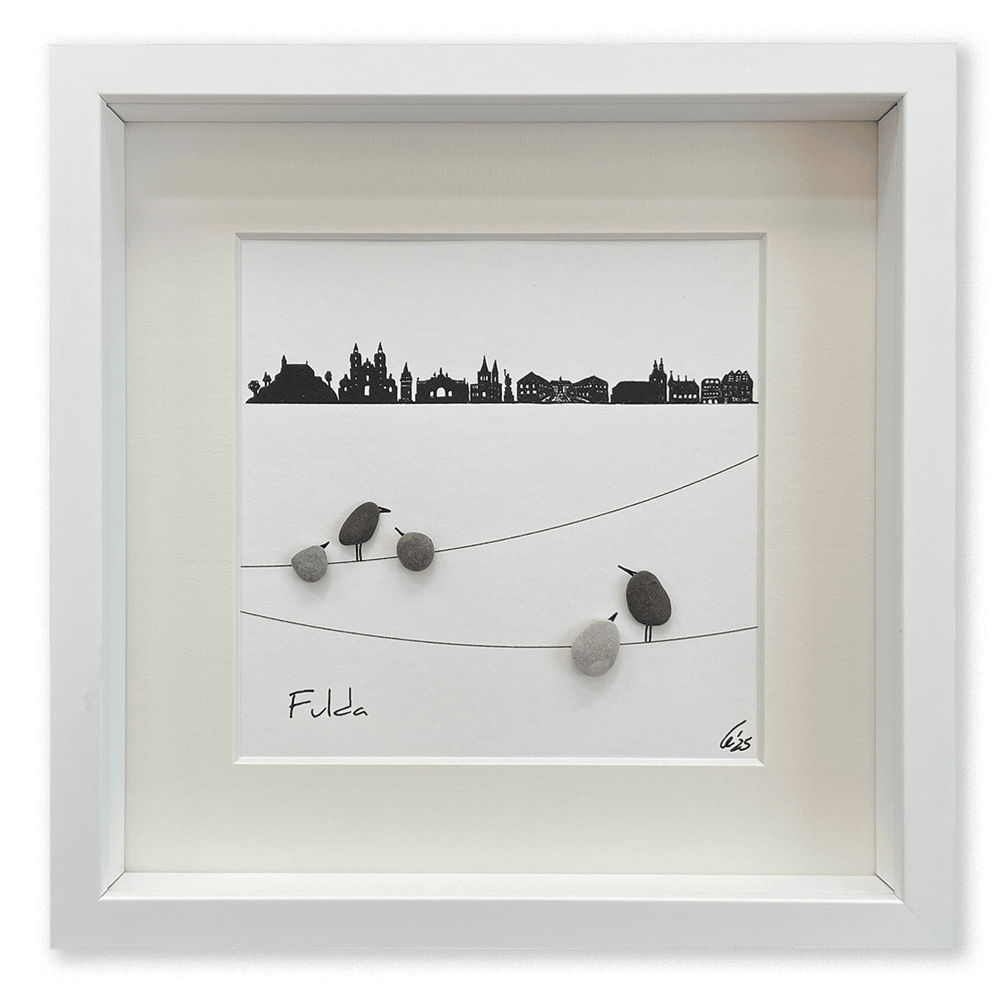 Sie erhalten ein Kieselsteinbild mit gedruckter Skyline der Stadt Fulda auf Aquarellpapier, optional gerahmt. Das Bild wird neu mit ähnlichen Steinen wie im Beispiel für Sie angefertigt, dabei sind leichte Abweichungen im Bezug auf Steinfarbe und Größe vom Beispielbild gewollt, denn jedes Bild ist ein Unikat.