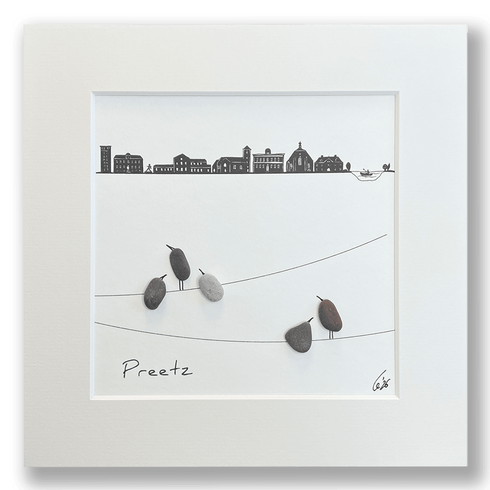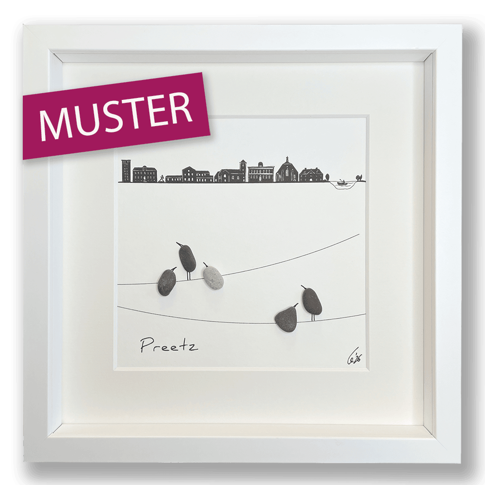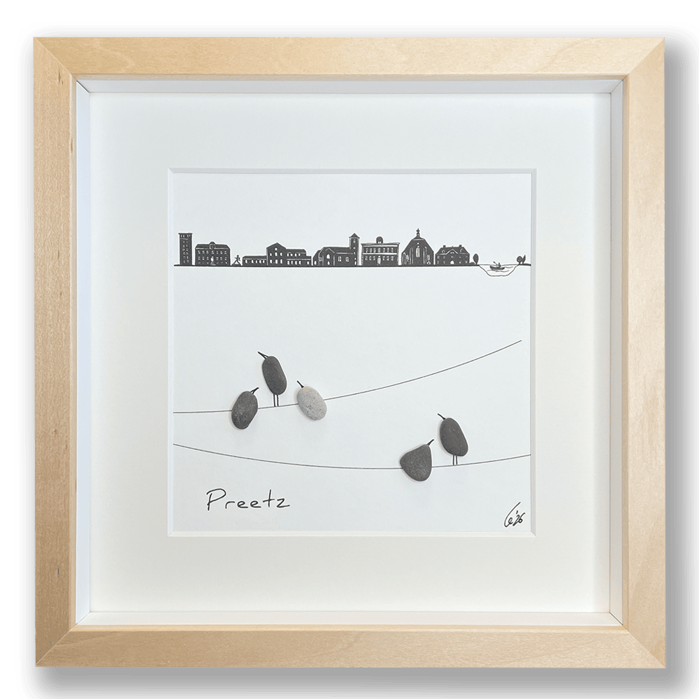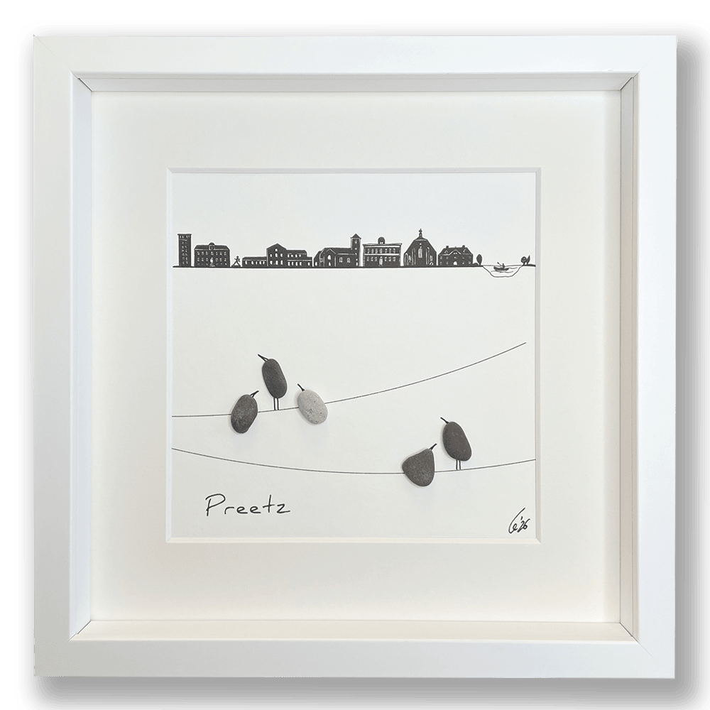 Sie erhalten ein Kieselsteinbild mit gedruckter Skyline der Stadt Preetz auf Aquarellpapier, optional gerahmt. Das Bild wird neu mit ähnlichen Steinen wie im Beispiel für Sie angefertigt, dabei sind leichte Abweichungen im Bezug auf Steinfarbe und Größe vom Beispielbild gewollt, denn jedes Bild ist ein Unikat.