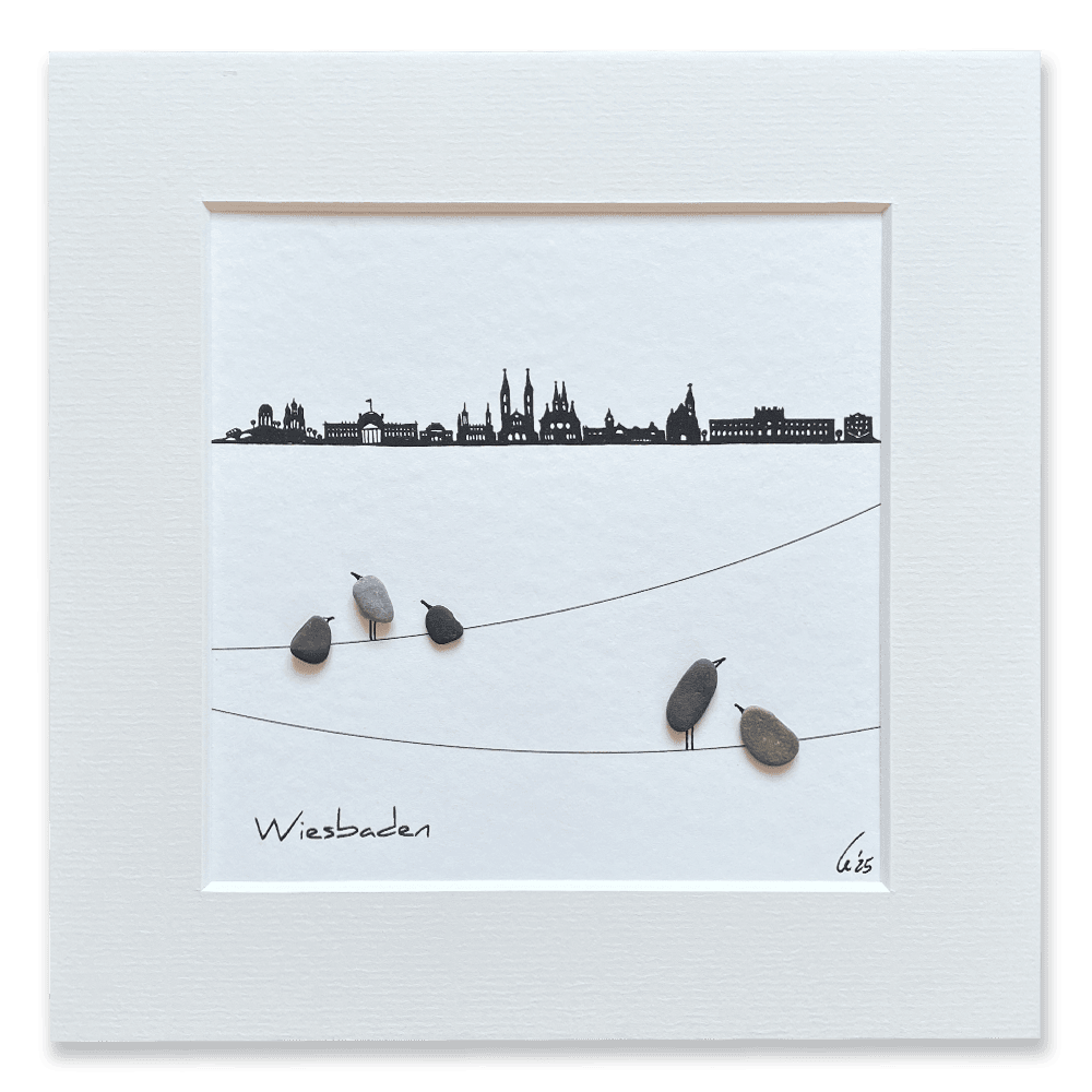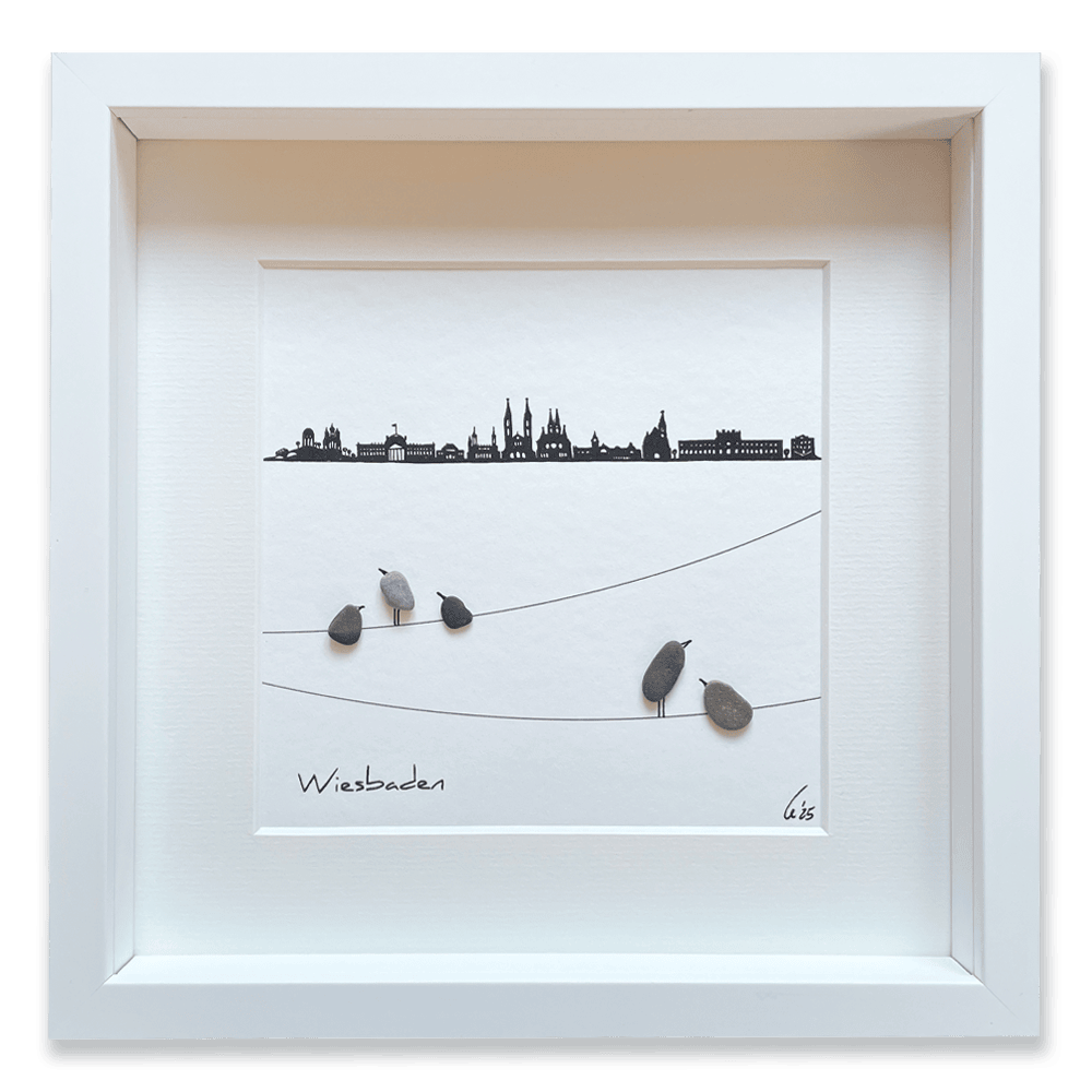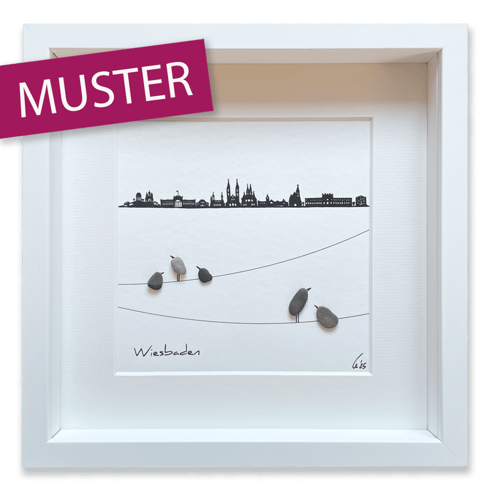 Sie erhalten ein Kieselsteinbild mit gedruckter Skyline der Stadt Wiesbaden auf Aquarellpapier, optional gerahmt. Das Bild wird neu mit ähnlichen Steinen wie im Beispiel für Sie angefertigt, dabei sind leichte Abweichungen im Bezug auf Steinfarbe und Größe vom Beispielbild gewollt, denn jedes Bild ist ein Unikat.