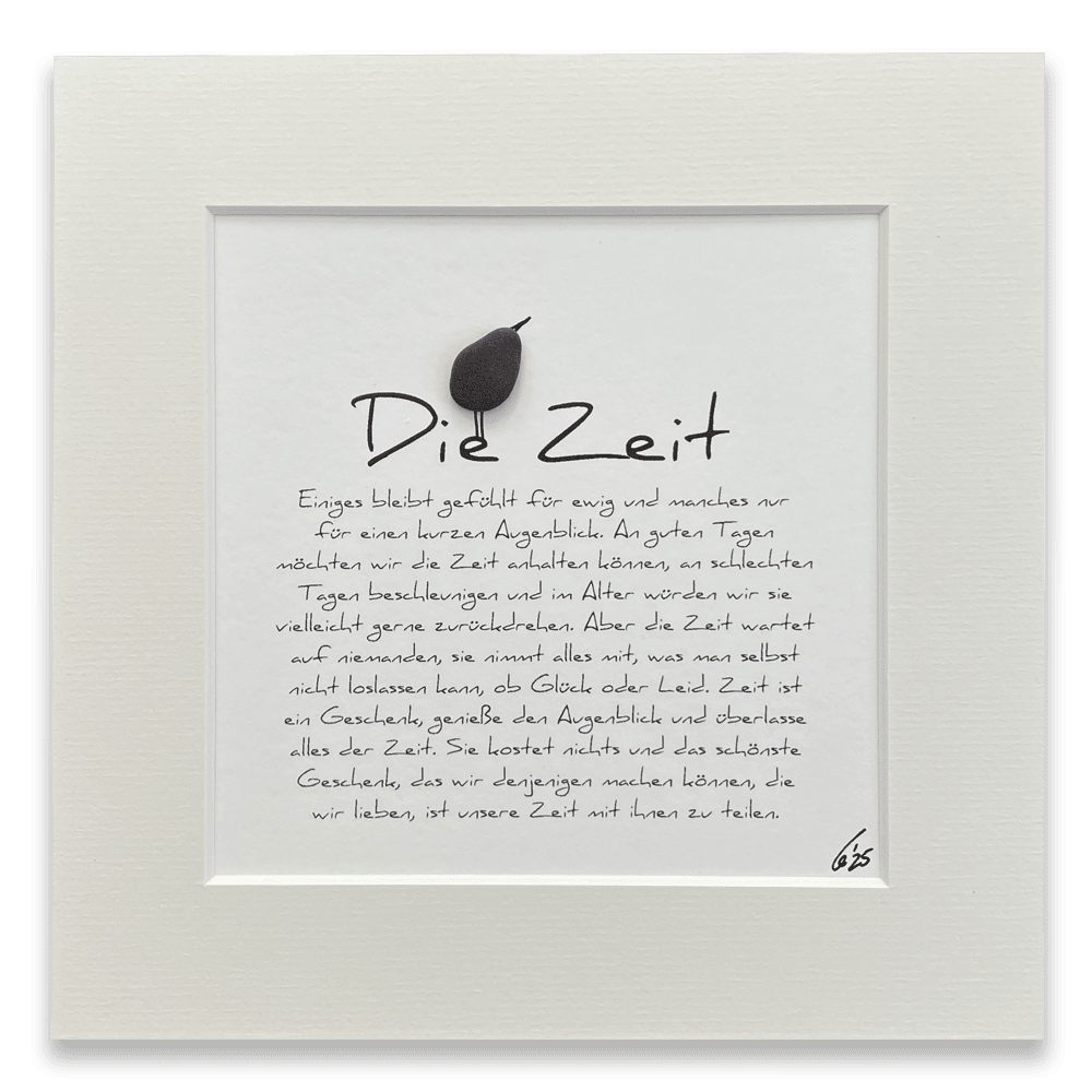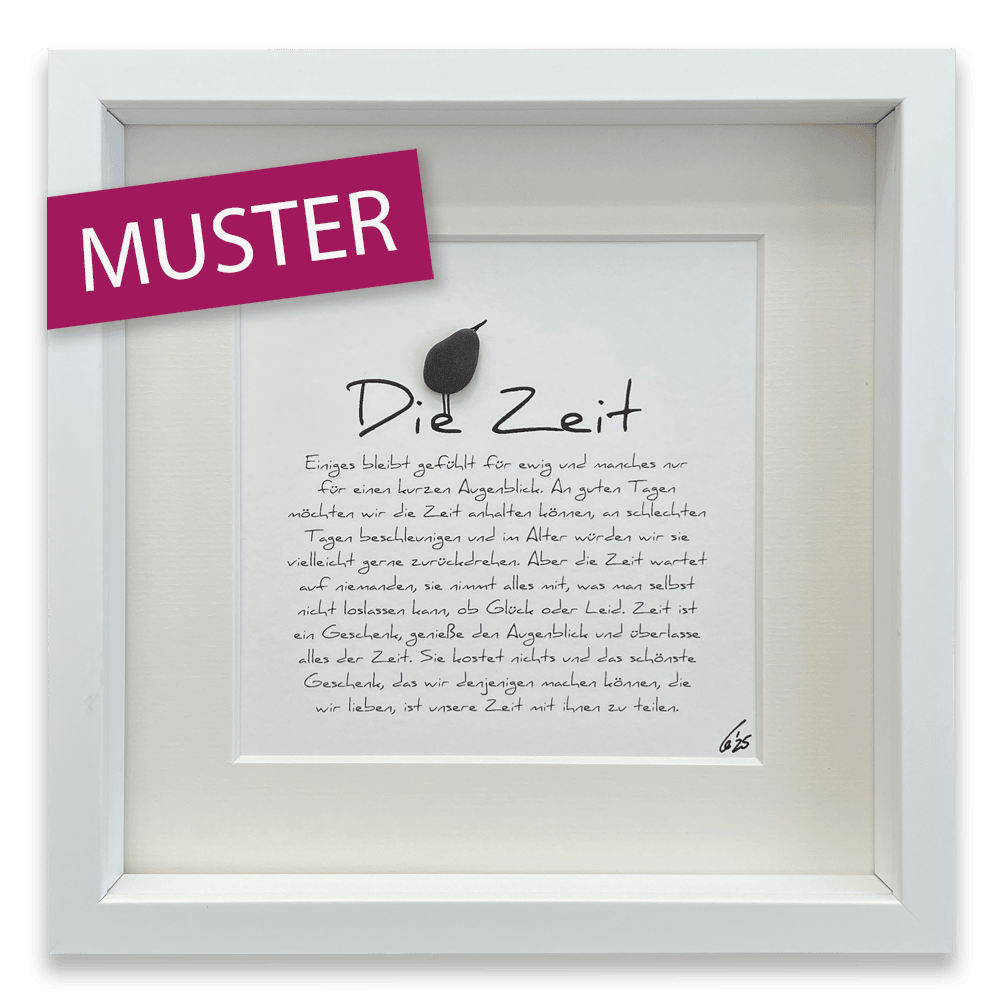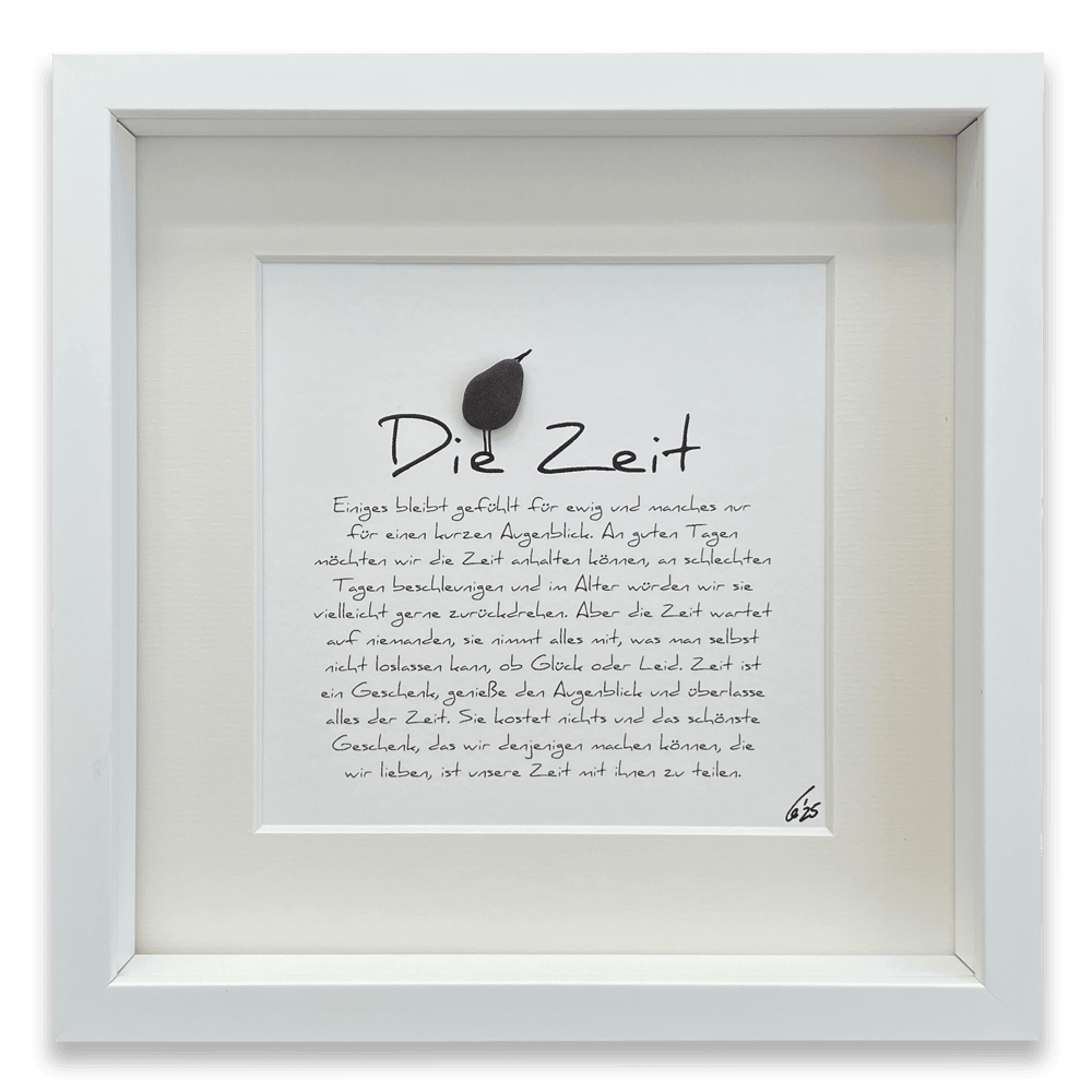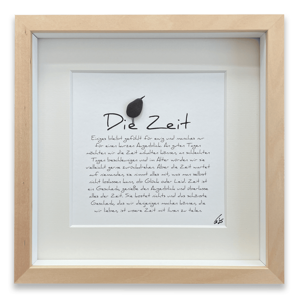 Sie erhalten ein Kieselsteinbild mit gedrucktem Text „Die Zeit“ auf Aquarellpapier, optional gerahmt. Das Bild wird neu mit ähnlichen Steinen wie im Beispiel für Sie angefertigt, dabei sind leichte Abweichungen im Bezug auf Steinfarbe und Größe vom Beispielbild gewollt, denn jedes Bild ist ein Unikat.