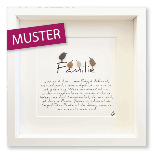 Sie erhalten ein Kieselsteinbild mit gedrucktem Text „Familie“ auf Aquarellpapier, optional gerahmt. Das Bild wird neu mit ähnlichen Steinen wie im Beispiel für Sie angefertigt, dabei sind leichte Abweichungen im Bezug auf Steinfarbe und Größe vom Beispielbild gewollt, denn jedes Bild ist ein Unikat.